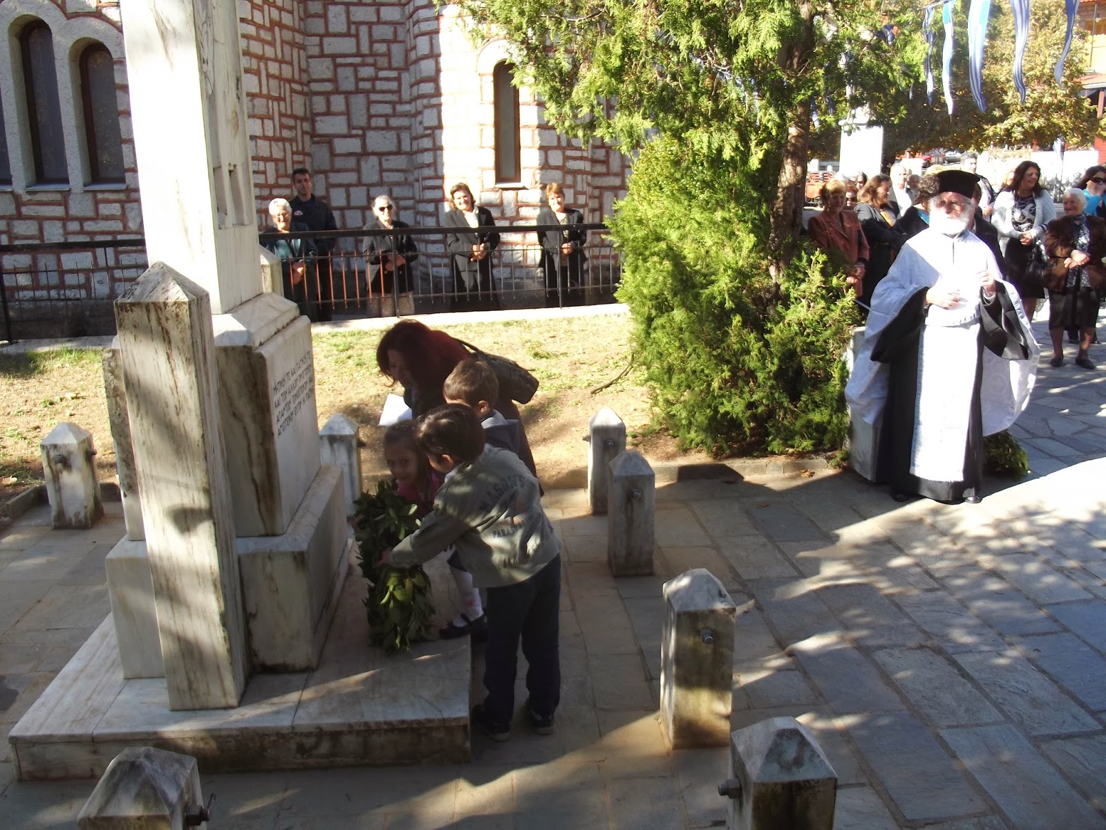 Κατόπιν έγινε επιμνημόσυνη δέηση στο μνημείο των πεσόντων, κατάθεση στεφάνων και απαγγελία ποιημάτων από μαθητές του Δημοτικού Σχολείου και του Νηπιαγωγείου,εψάλη ο Εθνικός Ύμνος και τηρήθηκε ενός λεπτού σιγή .